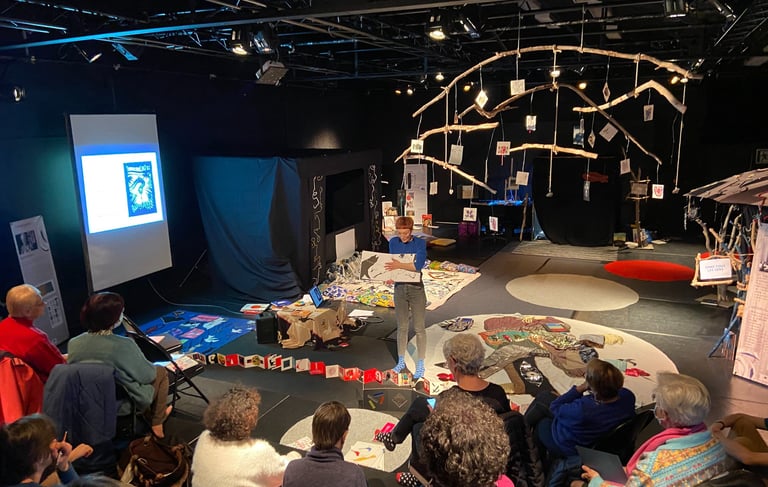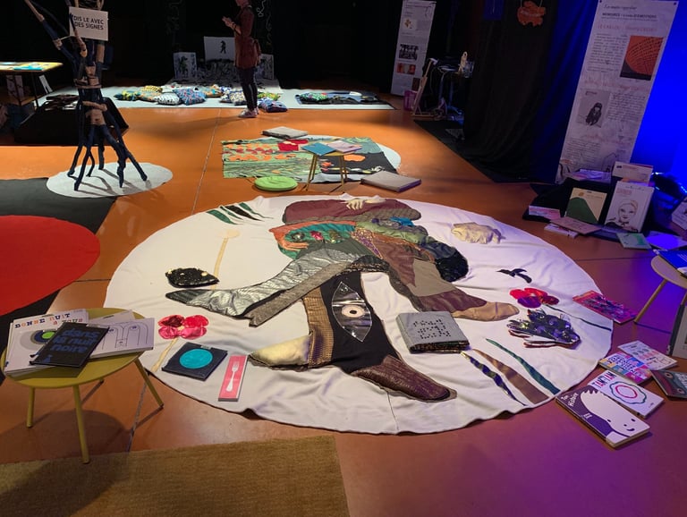 En partant des œuvres d'artistes, elle construit des expositions, des livres en tissus, des déplistoires et propose aussi des ateliers de pratiques artistiques pour tout âge.